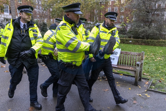 The Peace Garden, Tavistock Square, WC1H 9BQ — Saturday 22nd November 2025. Protesters gathered for the second London "Lift the Ban” event, opposing the government's ban on direct-action group Palestine Action. The demonstration formed part of the wider "Defend Our Juries” campaign. Police maintained a strong presence throughout the protest, during which approximately 100 people were arrested for terrorism offences., Credit:Abdullah Bailey / Avalon