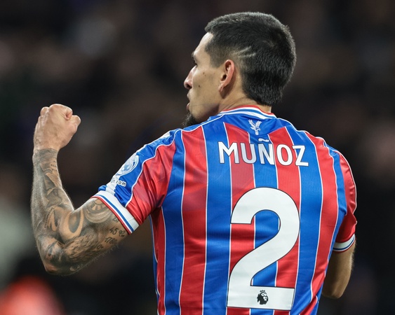 Daniel Munoz of Crystal Palace celebrates his goal to make it 0-1 during the Premier League match Wolverhampton Wanderers vs Crystal Palace at Molineux, Wolverhampton, United Kingdom, 22nd November 2025, Credit:Mark Cosgrove/News Images / Avalon