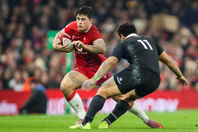 Louis Rees-Zammit of Wales takes on Caleb Clarke of New Zealand during the Quilter Nations Series 2025 match Wales vs New Zealand at Principality Stadium, Cardiff, United Kingdom, 22nd November 2025, Credit:Andrew Lewis/News Images / Avalon