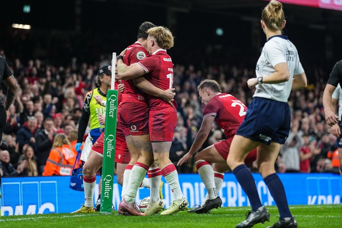 Louis Rees-Zammit of Wales celebrates scoring a try with his teammates during the Quilter Nations Series 2025 match Wales vs New Zealand at Principality Stadium, Cardiff, United Kingdom, 22nd November 2025, Credit:Andrew Lewis/News Images / Avalon