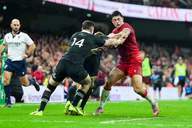 Louis Rees-Zammit of Wales is tackled by Will Jordan of New Zealand during the Quilter Nations Series 2025 match Wales vs New Zealand at Principality Stadium, Cardiff, United Kingdom, 22nd November 2025, Credit:Andrew Lewis/News Images / Avalon
