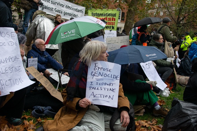 London, UK, 22nd November 2025 - Defend Our Juries protest in Tavistock Square as part of their "Lift The Ban" campaign, protestors openly expressed support for the proscribed organisation Palestine Action, by writing "I support Palestine Action" on placards and sitting on the floor, they were all arrested under the terrorism act en masse., Credit:Will Colebourne / Avalon