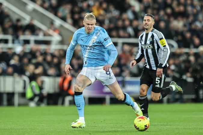 Erling Haaland of Manchester City breaks with the ball during the Premier League match Newcastle United vs Manchester City at St. James's Park, Newcastle, United Kingdom, 21st November 2025, Credit:Ae Cosgrove/News Images / Avalon
