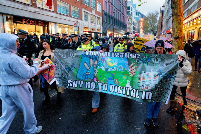 Saturday, November 22. London. "Unite Against Digital ID" protest march from Marble Arch to Trafalgar Square., Credit:Aldo Ciarrocchi / Avalon
