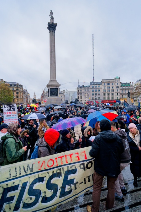 Saturday, November 22. London. "Unite Against Digital ID" protest march from Marble Arch to Trafalgar Square., Credit:Aldo Ciarrocchi / Avalon