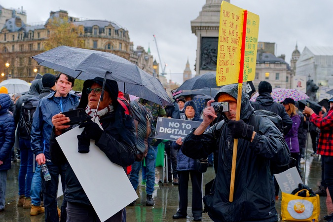 Saturday, November 22. London. "Unite Against Digital ID" protest march from Marble Arch to Trafalgar Square., Credit:Aldo Ciarrocchi / Avalon