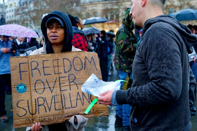 Saturday, November 22. London. "Unite Against Digital ID" protest march from Marble Arch to Trafalgar Square., Credit:Aldo Ciarrocchi / Avalon
