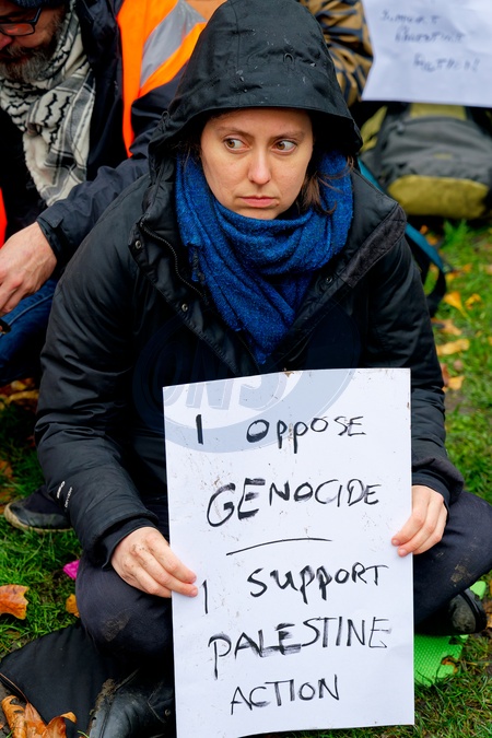 22 November 2025. London. Protesters gathered in Tavistock Square in a peaceful "Lift the Ban" protest organised by the group Defend Our Juries. The protesters hope to end to the proscription of Palestine Action, holding signs reading "I oppose genocide. I support Palestine Action” campaigners condemned the ban as an attack on democracy., Credit:Aldo Ciarrocchi / Avalon