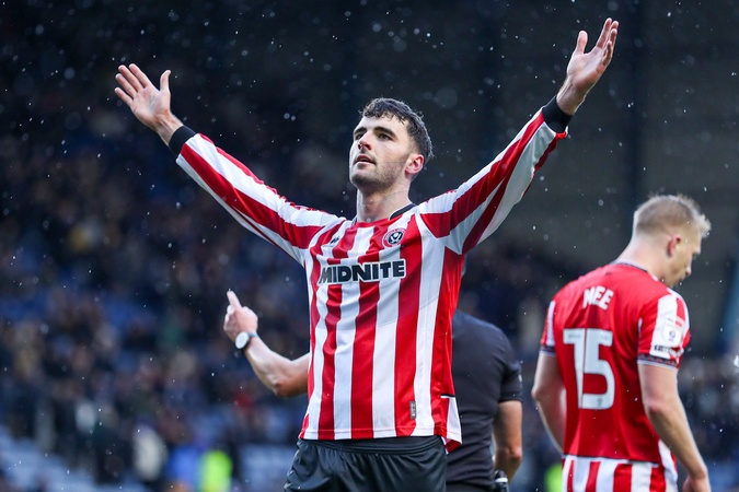Thomas Cannon of Sheffield United celebrates after scoring to make it 0-3 during the Sky Bet Championship match Sheffield Wednesday vs Sheffield United at Hillsborough, Sheffield, United Kingdom, 23rd November 2025, Credit:Jorge Horsted/News Images / Avalon