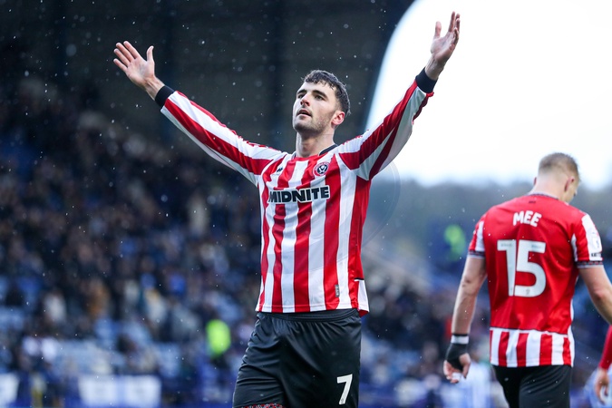 Thomas Cannon of Sheffield United celebrates after scoring to make it 0-3 during the Sky Bet Championship match Sheffield Wednesday vs Sheffield United at Hillsborough, Sheffield, United Kingdom, 23rd November 2025, Credit:Jorge Horsted/News Images / Avalon
