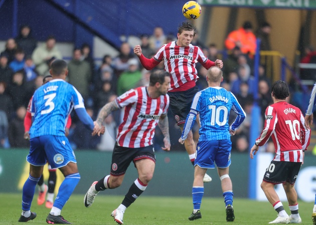 Sydie Peck of Sheffield United jumps up to win the high ball during the Sky Bet Championship match Sheffield Wednesday vs Sheffield United at Hillsborough, Sheffield, United Kingdom, 23rd November 2025, Credit:Richard Bierton/News Images / Avalon