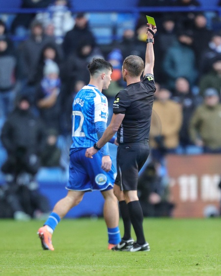 referee David Webb gives a yellow card to Harry Amass of Sheffield Wednesday during the Sky Bet Championship match Sheffield Wednesday vs Sheffield United at Hillsborough, Sheffield, United Kingdom, 23rd November 2025, Credit:Richard Bierton/News Images / Avalon