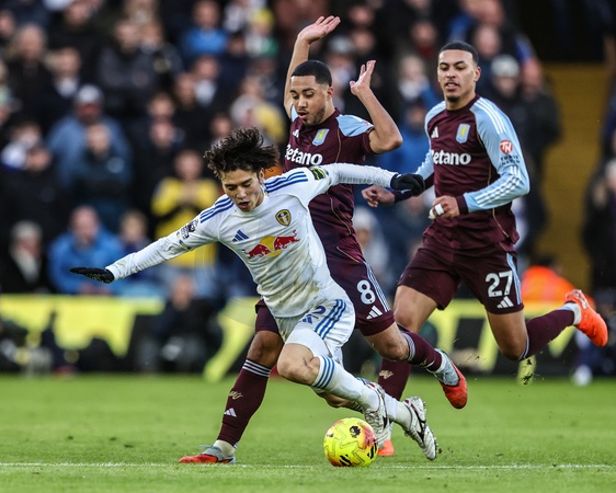 Ao Tanaka of Leeds United is fouled by Youri Tielemans of Aston Villa during the Premier League match Leeds United vs Aston Villa at Elland Road, Leeds, United Kingdom, 23rd November 2025, Credit:Ae Cosgrove/News Images / Avalon