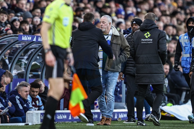 A fan is removed by security after walking onto the dugouts during the Premier League match Leeds United vs Aston Villa at Elland Road, Leeds, United Kingdom, 23rd November 2025, Credit:Ae Cosgrove/News Images / Avalon