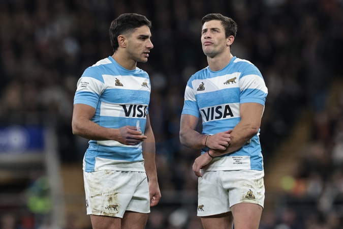 Santiago Carreras of Argentina speaks to Bautista Delguy of Argentina during the Quilter Nations Series 2025 match England vs Argentina at Allianz Stadium, Twickenham, United Kingdom, 23rd November 2025, Credit:Mark Cosgrove/News Images / Avalon