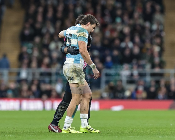 Juan Cruz Mallia of Argentina is aided off the field of play injured during the Quilter Nations Series 2025 match England vs Argentina at Allianz Stadium, Twickenham, United Kingdom, 23rd November 2025, Credit:Mark Cosgrove/News Images / Avalon