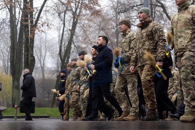 President of Ukraine Volodymyr Zelenskyy and First Lady Olena Zelenska honour the memory of the victims of the Holodomor of 1932–1933, along with the victims of mass man-made famines of 1921–1922 and 1946–1947. Laying sheaves at the Bitter Memory of Childhood monument, National Museum of the Holodomor-Genocide, Kyiv, Ukraine, 22 November 2025., Credit:Office of the President of Ukraine / Avalon