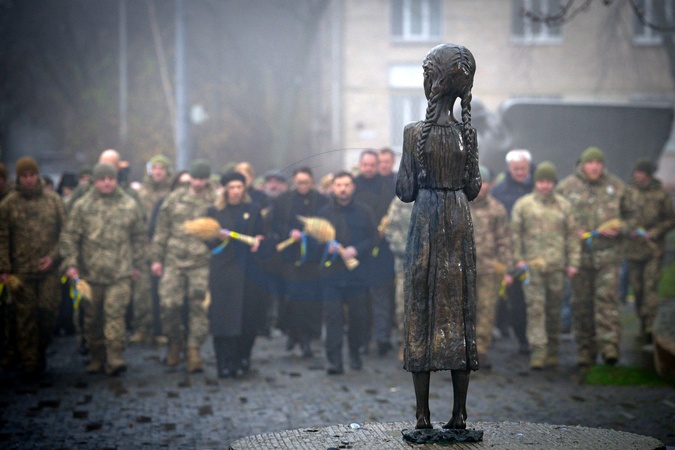 President of Ukraine Volodymyr Zelenskyy and First Lady Olena Zelenska honour the memory of the victims of the Holodomor of 1932–1933, along with the victims of mass man-made famines of 1921–1922 and 1946–1947. Laying sheaves at the Bitter Memory of Childhood monument, National Museum of the Holodomor-Genocide, Kyiv, Ukraine, 22 November 2025., Credit:Office of the President of Ukraine / Avalon