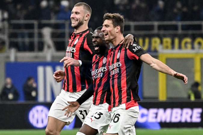 San Siro Stadium, Matchday 12 of the Serie A ENILIVE Championship. Inter vs. Milan. Strahinja PAVLOVIC, Fikayo TOMORI, and Matteo GABBIA run to hug Maignan. Milan, Italy 23 November 2025, Credit:Nicola Marfisi / Avalon