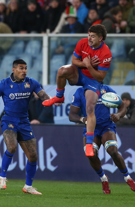 22/11/2025, Genoa Quilter Nations Series of Rugby Italy vs Chile, in the photo Monty Ioane watches the Chile player lose the oval, Credit:Massimo Lovati/AGF / Avalon