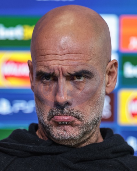 Pep Guardiola manager of Manchester City speaks to the press during the UEFA Champions League press conference Matchday 5 of 8 Manchester City vs Bayer 04 Leverkusen at Etihad Campus, Manchester, United Kingdom, 24th November 2025, Credit:Mark Cosgrove/News Images / Avalon