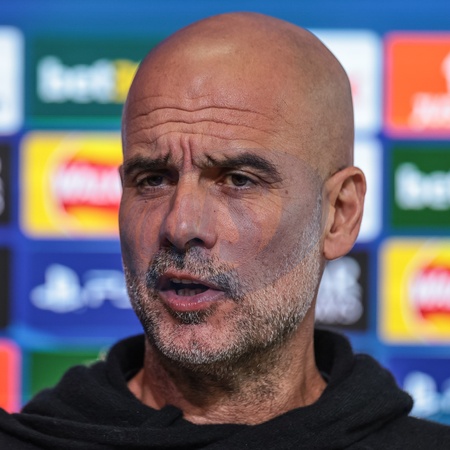 Pep Guardiola manager of Manchester City speaks to the press during the UEFA Champions League press conference Matchday 5 of 8 Manchester City vs Bayer 04 Leverkusen at Etihad Campus, Manchester, United Kingdom, 24th November 2025, Credit:Mark Cosgrove/News Images / Avalon