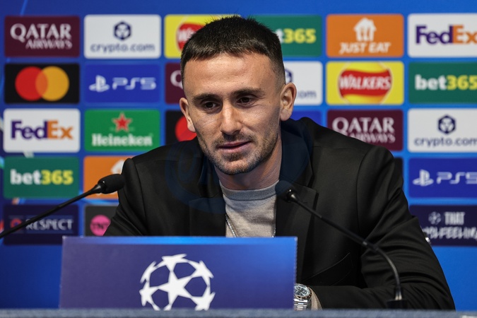 Aleix García of Bayer 04 Leverkusen speaks to the press during the UEFA Champions League press conference Matchday 5 of 8 Manchester City vs Bayer 04 Leverkusen at City of Manchester Stadium, Manchester, United Kingdom, 24th November 2025, Credit:Mark Cosgrove/News Images / Avalon