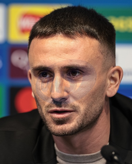 Aleix García of Bayer 04 Leverkusen speaks to the press during the UEFA Champions League press conference Matchday 5 of 8 Manchester City vs Bayer 04 Leverkusen at City of Manchester Stadium, Manchester, United Kingdom, 24th November 2025, Credit:Mark Cosgrove/News Images / Avalon