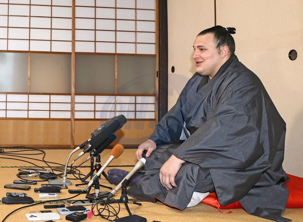 Ukrainian sumo wrestler Aonishiki holds a press conference at his stable's lodgings in Kurume in Fukuoka Prefecture, southwestern Japan, on Nov. 24, 2025, a day after winning the Kyushu Grand Sumo Tournament in the prefecture., Credit:Kyodo/Newscom / Avalon