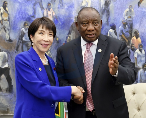 Japanese Prime Minister Sanae Takaichi (L) shakes hands with South African President Cyril Ramaphosa on the sidelines of a Group of 20 summit in Johannesburg on Nov. 23, 2025., Credit:Kyodo/Newscom / Avalon