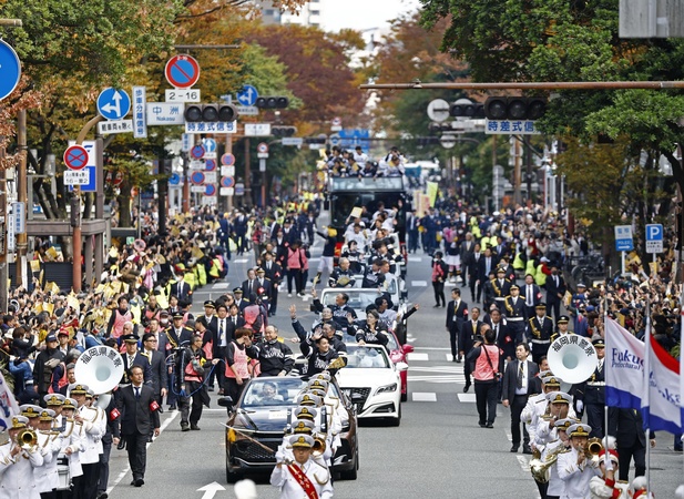 SoftBank Hawks players take part in a parade in Fukuoka, southwestern Japan, on Nov. 24, 2025, after clinching the Japan Series baseball title for the 2025 season., Credit:Kyodo/Newscom / Avalon