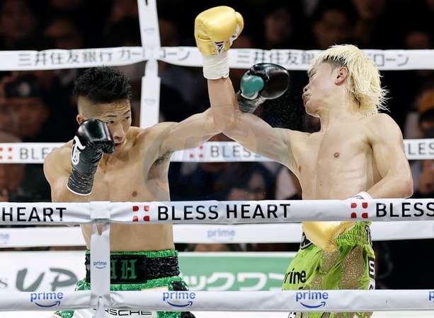 Takuma Inoue (L) of Japan and compatriot Tenshin Nasukawa trade punches in the third round of their WBC bantamweight world title bout at Toyota Arena Tokyo on Nov. 24, 2025., Credit:Kyodo/Newscom / Avalon