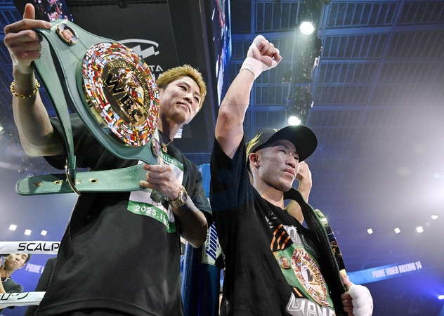 Takuma Inoue (R) of Japan raises his fist after beating compatriot Tenshin Nasukawa in their WBC bantamweight world title bout at Toyota Arena Tokyo on Nov. 24, 2025. Alongside him is his older brother and undisputed super bantamweight world champion, Naoya Inoue., Credit:Kyodo/Newscom / Avalon