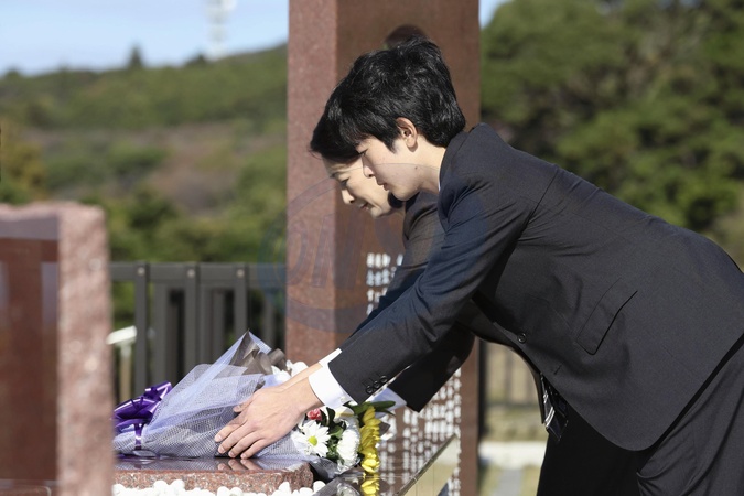 Japanese Crown Princess Kiko and her son Prince Hisahito offer flowers at a memorial for victims of a 2013 deadly mudslide disaster on Izu Oshima Island, south of Tokyo, on Nov. 22, 2025., Credit:Kyodo/Newscom / Avalon