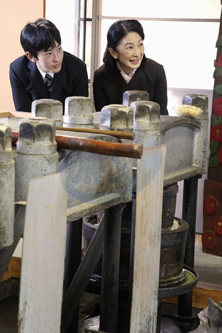 Japanese Crown Princess Kiko and her son Prince Hisahito visit a camellia oil refinery on Izu Oshima Island, south of Tokyo, on Nov. 22, 2025., Credit:Kyodo/Newscom / Avalon
