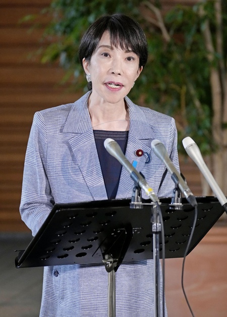 Japanese Prime Minister Sanae Takaichi meets the press at the prime minister's office in Tokyo on Nov. 25, 2025, following phone talks with U.S. President Donald Trump., Credit:Kyodo/Newscom / Avalon