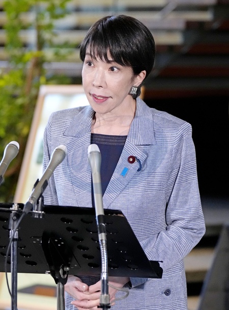Japanese Prime Minister Sanae Takaichi meets the press at the prime minister's office in Tokyo on Nov. 25, 2025, following phone talks with U.S. President Donald Trump., Credit:Kyodo/Newscom / Avalon