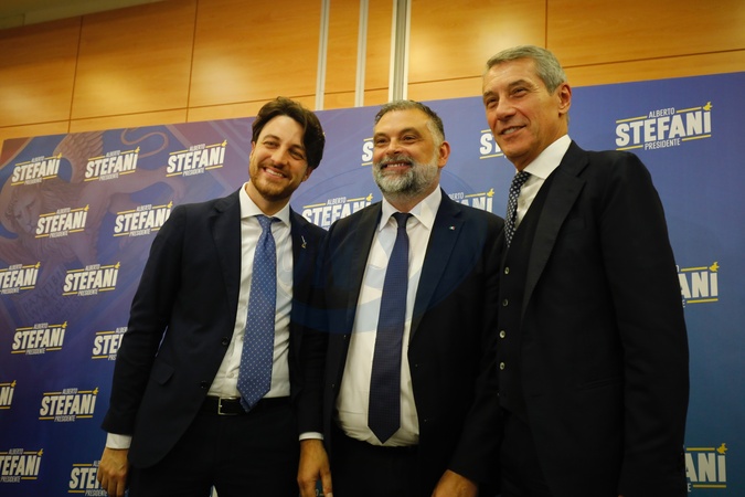 24/11/2025 Padua, the center-right candidate wins the regional elections in Veneto, in the photo the new president of the Region Alberto Stefani, Senator Luca De Carlo and De Poli, Senator Antonio De Poli, Credit:Mirco Toniolo/AGF / Avalon