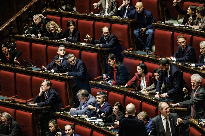 Chamber of Deputies, vote on the bill on the crime of femicide, to combat violence against women and protect victims. Pictured are Democratic Party members waving keys in the chamber. Rome, Italy 25 November 2025, Credit:Francesco Fotia / Avalon