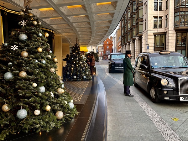 Christmas trees decorated with gold and silver ornaments line the entrance of The Dorchester hotel on Park Lane, London. A hotel doorman speaks to the driver of a London black cab as vehicles pull up to the iconic luxury hotel during the festive season., Credit:Alexander Seale / Avalon