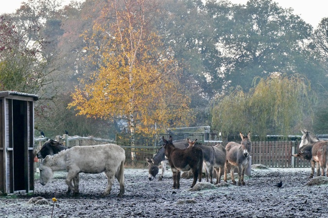 Donkeys in a paddock and a cold and frosty morning at dawn., Credit:Geoffrey Swaine / Avalon