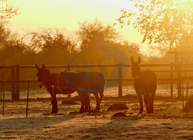 Donkeys in a paddock and a cold and frosty morning at dawn., Credit:Geoffrey Swaine / Avalon