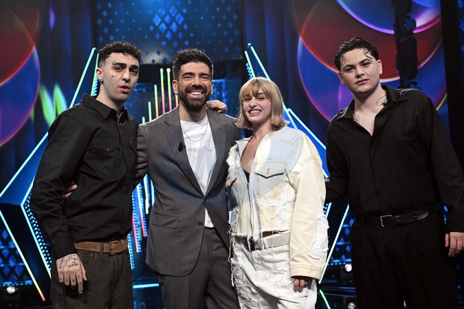 Rai 1 Tv Show, television program selection for Sanremo Giovani 2025. Pictured is Gianluca Gazzoli with Welo, Caro Wow, and Petit. . Rome, Italy 25 November 2025, Credit:Maria Laura Antonelli / Avalon