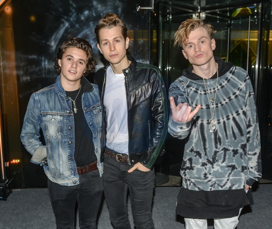 James McVey, Tristan Evans and Bradley Simpson of The Vamps arriving at the Universal Music BRIT Awards After-Party 2016 in collaboration with Soho House and BACARDI 180, The Strand, London