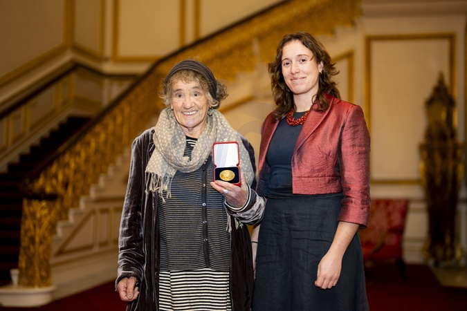 Ms Selima Hill (left) with her granddaughter Ms Phoebe Hill after being presented with the King's Gold Medal for Poetry for 2022 at Buckingham Palace, London. Picture date: Wednesday November 26, 2025., Credit:Jordan Pettitt / Avalon