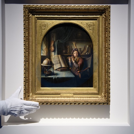 Art handlers 'The Flute Player' by Gerrit Dou (est. £2m - £3m) as part of Christie's 'Old Masters Evening Sale' Auction which will take place on 2nd December 2025 - Christie's King Street, London, England, UK on Thursday 27 November, 2025., Credit:Justin Ng / Avalon