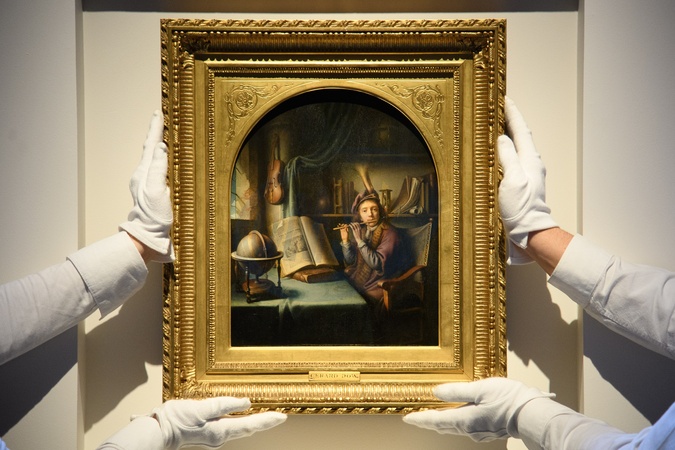 Art handlers 'The Flute Player' by Gerrit Dou (est. £2m - £3m) as part of Christie's 'Old Masters Evening Sale' Auction which will take place on 2nd December 2025 - Christie's King Street, London, England, UK on Thursday 27 November, 2025., Credit:Justin Ng / Avalon