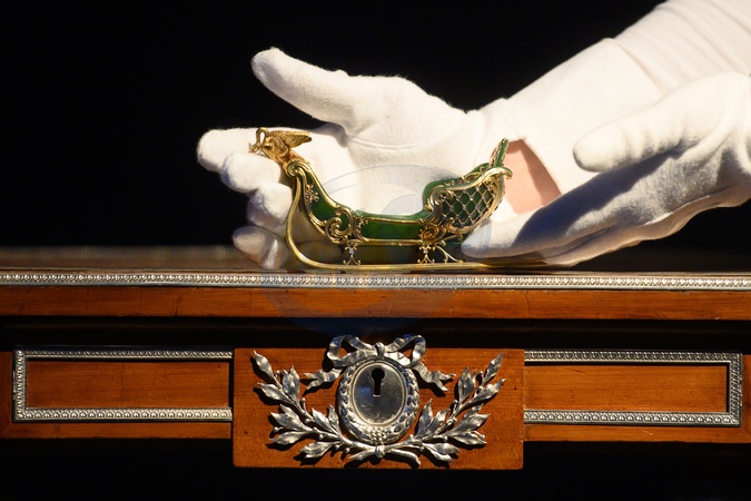 An art handler holds 'A rare jewelled Gold-Mounted Nephrite Miniature Model of a sleigh' by Faberge workmaster Michael Perchin (est. £350k - £450k) as part of Christie's 'The Winter Egg and Important Works by Faberge from a Princely Collection' Auction which will take place on 2nd December 2025 - Christie's King Street, London, England, UK on Thursday 27 November, 2025., Credit:Justin Ng / Avalon