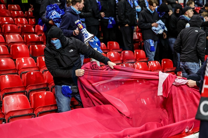 Malmo fans pull the netting away to get to the front of the stand during the UEFA Europa League Matchday 5 of 8 Nottingham Forest vs Malmo FF at City Ground, Nottingham, United Kingdom, 27th November 2025, Credit:Mark Cosgrove/News Images / Avalon
