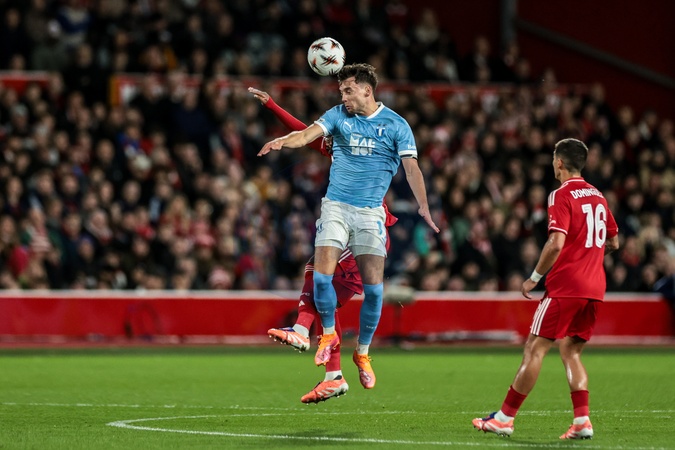 Colin Rosler of Malmo FF jumps up to win the high ball during the UEFA Europa League Matchday 5 of 8 Nottingham Forest vs Malmo FF at City Ground, Nottingham, United Kingdom, 27th November 2025, Credit:Mark Cosgrove/News Images / Avalon